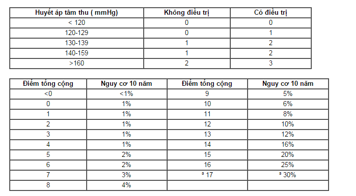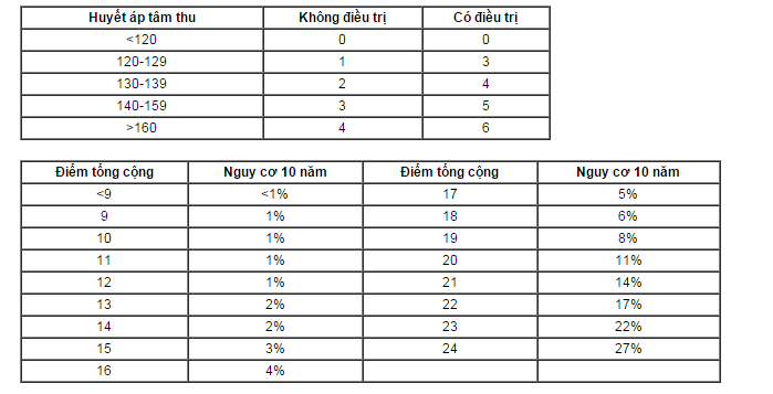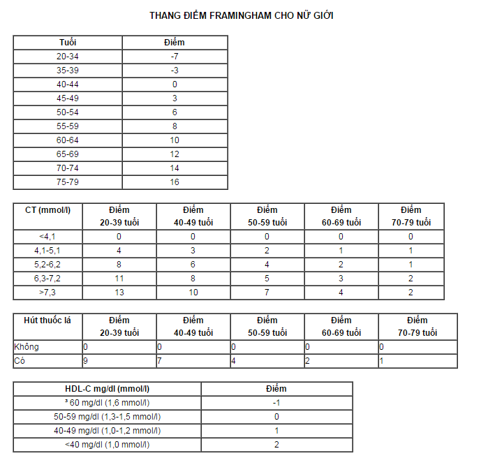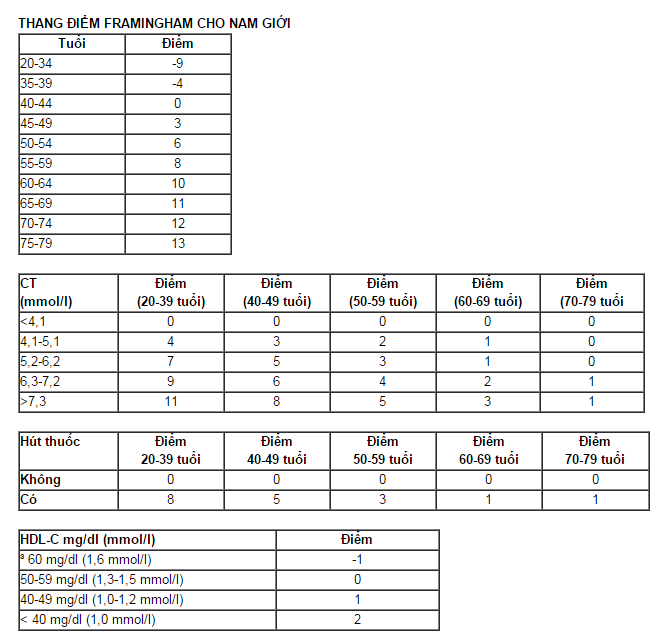 Để ước tính nguy cơ mắc bệnh lý tim mạch trong vòng 10 năm, người ta sử dụng thang điểm Framingham. Thang điểm Framingham được tính riêng cho nam giới và nữ giới, các thông số trong thang điểm bao gồm: tuổi, tình trạng hút thuốc, huyết áp tâm thu, nồng độ cholesterol và nồng độ HDL. Sau khi tính tổng điểm ta dễ dàng quy ra phần trăm nguy cơ mắc bệnh lý tim mạch trong vòng 10 năm tới cho người bệnh.