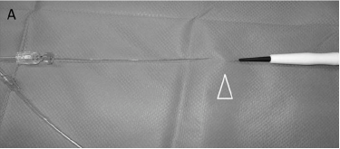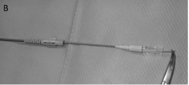 Hình 2: A- đường dẫn của mũi khoan được cắt bằng kéo; B – đưa ống thông Heartrail vào sát mũi khoan; C – toàn bộ hệ thống được đồng thời đưa ra ngoài; D – hình ảnh sau đặt stent.