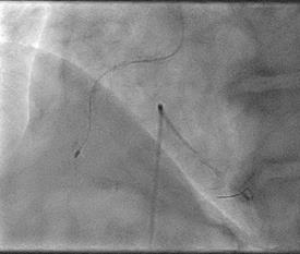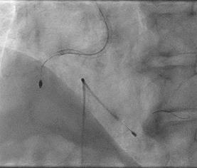Can thiệp ngã ba động mạch liên thất trước và nhánh chéo 1 với hai stent có bọc thuốc bằng kĩ thuật cullote. Tiếp tục can thiệp động mạch vành phải với ống thông can thiệp (guiding catheter) (Cordis JR4 cm 6Fr) và dây dẫn (Asahi Sion 0.014”). Nong tổn thương bằng bóng 3.5 x 15mm (Neich Sapphire), bóng 4.0 x 12 (NC Quantum Apex), bóng cắt 3.5 x 15 (Cutting balloon, Angiosculpt) không làm vỡ được mảng vữa xơ. Quyết định dùng hệ thống khoan cắt mảng vữa xơ với dây dẫn mềm (Boston Scientific Rotablator Rotalink Plus) và mũi khoan (burr) 1.5mm. Tuy nhiên vì kích thước động mạch quá lớn nên mũi khoan đi qua tổn thương mà không chạm vào mảng vữa xơ được. Chuyển sang mũi khoan có đường kính lớn hơn 2.15mm với tốc độ khoan 150000 vòng /phút. Khi mũi khoa đi qua được 1/3 tổn thương thì không thể di chuyển được tiếp. Nhận định tại thời điểm đó là mũi khoan bị kẹt trong tổn thương tại đoạn giữa của động mạch vành phải. Ngay lập tức các bác sỹ có kinh nghiệm can thiệp trong bệnh viện được mời đến phòng can thiệp đồng thời thông báo cho các phẫu thuật viên tim mạch chuẩn bị trong trường hợp cần thiết. Bệnh nhân có biểu hiện đau tức ngực trái, tuy nhiên mạch và huyết áp tương đối ổn định, điện tim không thay đổi. Dòng chảy trong động mạch vành còn duy trì nhưng chậm TIMI 2. Sau khi hội ý, hướng xử trí đầu tiên là dùng dây dẫn cứng Conquest Pro (Asahi) để đi qua tổn thương nhưng không thành công. Sau đó chúng tôi quyết định cắt đoạn đầu của hệ thống nối mũi khoan, đưa ống thông heartrail (Terumo) sát vào mũi khoan nhằm thay đổi tư thế và cố định mũi khoan vào dây dẫn để đưa ra ngoài. Cuối cùng mũi khoan được đưa ra ngoài thành công. Tổn thương tiếp tục được nong bằng bóng cắt và bóng áp lực cao và đặt được giá đỡ kim loại (stent) bọc thuốc 4.0 x 26mm. Kết quả là động mạch vành được mở rộng hoàn toàn, bệnh nhân không còn đau ngực, huyết động ổn định.
