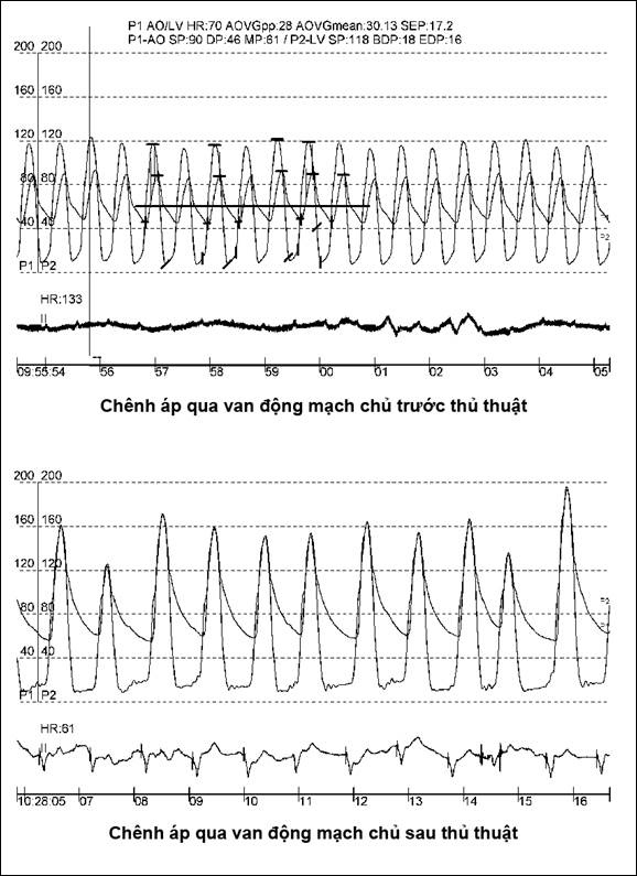 Chúng tôi tiến hành thông tim trái để khảo sát tình trạng huyết động học trước thủ thuật. Áp lực động mạch chủ là 87/46 mmHg, áp lực tâm thu thất trái 119 mmHg, áp lực cuối tâm trương thất trái 17 mmHg, đánh giá chênh áp trung bình qua lỗ van động mạch chủ là30 mmHg, chênh áp đỉnh-đỉnh là 28 mmHg.