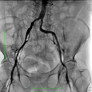 Hình 1: Đánh giá động mạch đùi - chậu bằng phim chụp cản quang Thủ thuật được tiến hành tại phòng tim mạch can thiệp, viện Tim mạch Quốc gia Việt Nam, bệnh viện Bạch Mai, Hà Nội. Bệnh nhân được gây mê nội khí quản. Sau đó, đặt đầu dò siêu âm qua thực quản. Đặt điện cực tạo nhịp tạm thời ở mỏm thất phải qua đường tĩnh mạch cảnh trong phải. Dựa theo kết quả chụp động mạch đùi cản quang có hẹp động mạch đùi phải, đường can thiệp được lựa chọn là đường động mạch đùi trái. Trước tiên, chúng tôi tiến hành mở đường vào động mạch đùi phải, đặt sheath 6 French. Qua đường động mạch đủi phải, một ống thông IMA được đưa vào động mạch đủi trái và chụp chọn lọc động mạch đùi trái. Mở đường vào động mạch đùi trái dưới hướng dẫn của màn huỳnh quang tăng sáng. Đẩy một sheath kích cỡ 18 French, dài 90 cm qua đường động mạch đùi lên động mạch chủ bụng. Một ống thông pigtail được đưa lên gốc động mạch chủ qua đường động mạch đùi phải.