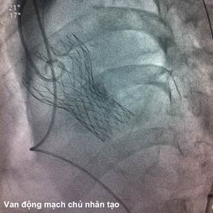 Dây dẫn Amplatz siêu cứng kích cỡ 0,035 inch (hãng Boston Scientific, Hoa Kỳ) được đẩy xuống buồng thất trái qua sheath 18 French. Tiến hành nong van động mạch chủ sử dụng bóng đường kính 22 mm, chiều dài 30 mm (hãng NuMED, Hoa Kỳ) khi tiến hành tạo nhịp thất nhanh. Sau đó, van sinh học CoreValve kích thước 29 mm được đặt ở vòng van động mạch chủ dưới hướng dẫn của màn huỳnh quang tăng sáng. Bệnh nhân xuất hiện bloc nhĩ thất độ 3 thoáng qua sau khi đặt van, tuy nhiên sau đó tự hồi phục về nhịp xoang. Kết quả chụp động mạch chủ cho thấy van động mạch chủ nhân tạo nằm đúng vị trí, chỉ có hở rất nhẹ cạnh chân van. Thông tim cho thấy không còn chênh áp qua van động mạch chủ (hình 3). Siêu âm tim qua thực quản và chụp gốc động mạch chủ ngay sau khi đặt van cho thấy van nằm đúng vị trí, hở rất nhẹ quanh van (hở độ I). Sau khi đã kiểm tra vị trí van trên phim chụp mạch cản quang và siêu âm tim, sheath 18 Fr được rút ra và động mạch đùi được đóng lại bằng 2 dụng cụ Perclose. Sau thủ thuật, bệnh nhân được chuyển về khoa hồi sức tích cực tim mạch. Người bệnh được rút ống nội khí quản sau 20 giờ. Điện cực tạo nhịp tạm thời được rút sau 3 ngày. Không xuất hiện các rối loạn nhịp sau can thiệp. Không có tình trạng nhiễm khuẩn sau thủ thuật. Bệnh nhân được xuất viện sau 8 ngày, không có biến chứng. Bệnh nhân được duy trì các thuốc điều trị suy tim, dùng aspirin 100 mg/ngày, clopidogrel 75 mg/ngày. Trong thời gian theo dõi 30 ngày sau thủ thuật, hoàn toàn không ghi nhận các biến cố tim mạch lớn (chảy máu nặng, tai biến mạch não, nhồi máu cơ tim, rối loạn nhịp tim, phải nhập viện vì suy tim). Tình trạng lâm sàng của người bệnh cũng được cải thiện rõ rệt (NYHA I, không còn đau ngực, thể trạng tốt).