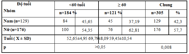 Trong số 105 bệnh nhân suy giãn tĩnh mạch có tỷ lệ mắc nữ/ nam là 4/1, trong đó nữ chiếm đến 82% Biểu đồ số 1. Sự khác biệt về giới trong mẫu nghiên cứu của chúng tôi là có ý nghĩa thống kê với với p < 0,01. Theo kết quả nghiên cứu, tuổi trung bình của bệnh nhân là 60,57 ± 13,18 với phạm vi tuổi của nhóm nghiên cứu là 33-91. Nhóm bệnh nhân chiếm tỷ lệ cao nhất có độ tuổi 41-60 với 48,6%; nhóm bệnh nhân già 60-80 tuổi cũng chiếm tỷ lệ cao đến 38,5%, p < 0,01. Kết quả này phù hợp với đa số các kết quả nghiên cứu trong nước và trên thế giới với tỷ lệ mắc bệnh của nữ > 70% và tuổi trung bình nằm trong khoảng 40-60 tuổi [2], [8], [15]...