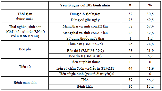 Bệnh nhân thừa cân và béo phì độ I với BMI<30 có tỷ lệ mắc chiếm ưu thế (46,7%) còn bệnh nhân béo phì độ II với BMI >30 chỉ có 6,7%. Tuy nhiên, kết quả này cũng đã chỉ ra rằng > 50% bệnh nhân STMMT trong mẫu nghiên cứu có biểu hiện thừa cân và béo phì. Bệnh nhân có tiền sử đã được chẩn đoán và có điều trị hoặc không điều trị bệnh suy tĩnh mạch chi dưới có tỷ lệ mắc chiếm 41,9% và không có bệnh nhân nào có tiền sử phẫu thuật hay yếu tố di truyền, sự khác biệt này có ý nghĩa thống kê với p < 0,05. Kết quả về yếu tố di truyền của chúng tôi rất khác biệt với các nghiên cứu khác vì đa số công trình đều cho rằng di truyền là một yếu tố nguy cơ của bệnh [17], [7], [8], [23]. Theo tác giả Bùi Minh Thành, tiền sử gia đình có người mắc bệnh chiếm tỷ lệ 9/29 (31%) tổng số bệnh nhân STMMT; yếu tố gia đình theo các tác giả nước ngoài như Kanchanabat B. và Chiesa hay Ahti T.M. và cs [17], [15] thì tỷ lệ này là từ 29 – 47,5%. Sự khác biệt này có thể gây ra cũng có thể là do cỡ mẫu nghiên cứu không đồng nhất và cộng đồng nghiên cứu không giống nhau.