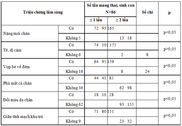 Bảng tìm hiểu về mối liên quan giữa các yếu tố nguy cơ và các biểu hiện lâm sàng theo bảng số 9 cho thấy có sự liên quan có ý nghĩa thống kê giữa số lần mang thai, sinh con với một số các biểu hiện lâm sàng như vọp bẻ về đêm, phù mắt cá chân đổi màu sắc da chân và nặng mỏi chân với (p< 0,05). Cũng nghiên cứu về vấn đề này, kết quả nghiên cứu còn cho thấy không có mối liên quan có ý nghĩa thống kê giữa số lần mang thai, sinh con với các triệu chứng tê dị cảm hay giãn tĩnh mạch khu trú với (p>0,05). Kết quả này hầu như phù hợp với một số nghiên cứu của những tác giả khác vì trong đa số trường hợp, triệu chứng lâm sàng của STMMT có liên quan rõ ràng với tiền sử thai nghén của phụ nữ [8], [15], [22], [27], [28]… Trong thời kỳ mang thai, dưới tác dụng của nội tiết tố và sự chèn ép, hai nguy cơ về bệnh lý mạch máu nặng thường gặp nhất là thuyên tắc động mạch phổi và suy giãn tĩnh mạch, có thể có kèm theo huyết khối lòng mạch. Tuy nhiên cũng có một phần khác biệt nhỏ là triệu chứng cảm giác tê,dị cảm và giãn TM lan tỏa 2 chi dưới lại có kết quả không phù hợp với những nghiên cứu của những tác giả khác.