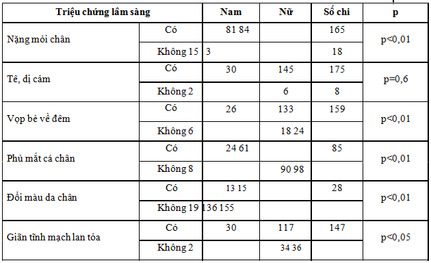 Triệu chứng thực thể gặp với tỷ lệ cao nhất là giãn tĩnh mạch khu trú (82,5%) và giãn TM toàn bộ chi dưới (80,3%); phù mắt cá trong với 46,5%;
