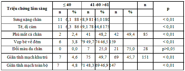 Bảng kết quả 11 cho thấy yếu tố tuổi có liên quan có ý nghĩa thống kê với dấu vọp bẻ về đêm, sưng nặng chân, tê dị cảm, phù mắt cá chân, đồng thời liên quan với dấu hiệu đổi màu da chân, giãn tĩnh mạch khu trú vùng khoeo hay giãn TM lan tỏa vùng đùi, bắp chân với p<0,01.Theo nghiên cứu của Chiesa và cộng sự [9] có mối liên quan tuyến tính giữa các triệu chứng phù, giãn tĩnh mạch, loạn dưỡng da và tuổi, tác giả cho thấy tần suất loét chi gia tăng từ 0,1% trước 50 tuổi lên 0,6% tuổi > 50. Theo Musil và cộng sự [29] có mối liên quan thuận chiều giữa tuổi và độ nặng của bệnh theo CEAP với r= 0,379, p < 0,01. Theo nghiên cứu của Welch và cộng sự [24] khi so sánh độ tuổi trung bình ở 3 nhóm, nhóm 1 bao gồm C1-3, nhóm 2 C4, nhóm 3 C5-6, độ tuổi trung bình của nhóm 1 là 47,5; độ tuổi trung bình nhóm 2 là 46, độ tuổi trung bình nhóm 3 là 50,3. Nhiều tài liệu cho thấy tuổi là một yếu tố nguy cơ của bệnh, có mối liên quan giữa tuổi với các triệu chứng, giai đoạn tiến triển của bệnh và cần có sự chăm sóc và điều trị sớm [2], [8], [30], [15]. Nghiên cứu của chúng tôi không có trường hợp nào có loét chân trong khi phần lớn các tác giả khác cho thấy có sự gia tăng tần số loét chân ở những bệnh nhân lớn tuổi. Cũng có thể do đặc điểm bệnh nhân trong lô nghiên cứu là bệnh nhân của bệnh viện Nguyễn Trãi hầu như là cán bộ công chức của thành phố sự hiểu biết và ý thức về sức khỏe của họ cao những bệnh nhân lớn tuổi vẫn có chế độ lao động, tập thể dục thường xuyên nên không có triệu chứng loét hoặc sự gia tăng độ nặng của bệnh ở người lớn tuổi.