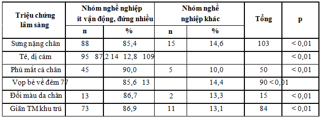 Bảng kết quả 12 cho thấy yếu tố nghề nghiệp có liên quan có ý nghĩa thống kê với cảm giác nặng mỏi chân, sưng nặng chân tê, dị cảm, phù mắt cá chân,vọp bẻ về đêm, thay đổi màu da chân, giãn TM khu trú trong số tất cả các biểu hiện lâm sàng của STMMT với (p<0,01).