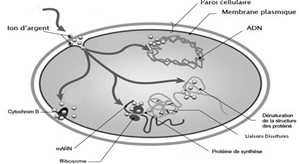 Ion bạc gây ra việc phát tán các ion kali từ các vi sinh vật, màng tế bào chất của vi khuẩn hoặc vi khuẩn mà màng nội bào cũng chứa nhiều các enzym ái tính cao có thể là mục tiêu của các ion bạc [5]. Ngoài tác dụng trên enzym, các ion Ag gây ra những thay đổi khác về các vi sinh vật. Bạc nitrat gây ức chế cụ thể của sự phát triển ( phát triển ) của Cryptococcus neoformans và được gửi trong tế bào chất của tế bào , tạo thành các ion Ag ức chế phân chia tế bào và làm tổn hại đến màng tế bào và các bào quan của P.aeruginosa Cuối cùng, các ion Ag tương tác với axit nucleic. Chúng tương tác chủ yếu với phốt phát DNA mặc dù việc loại bỏ các vi khuẩn thông qua sự tương tác này là không rõ ràng.