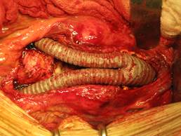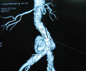 Hình 3: Phình động mạch chủ bụng vỡ vào cột sống thắt lưng và thay động mạch nhân tạo hình chữ Y