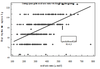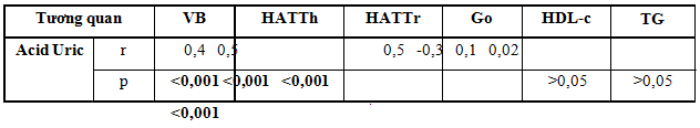- Có mối tương quan mức độ vừa giữa nồng độ acid uric huyết thanh với số đo vòng bụng (r = 0,4; p < 0,01), huyết áp tâm thu (r = 0,5; p < 0,001), huyết áp tâm trương (r = 0,5; p < 0,001), creatinin (r = 0,298; p < 0,001), glucose máu lúc đói (r = -0,3; p < 0,001).