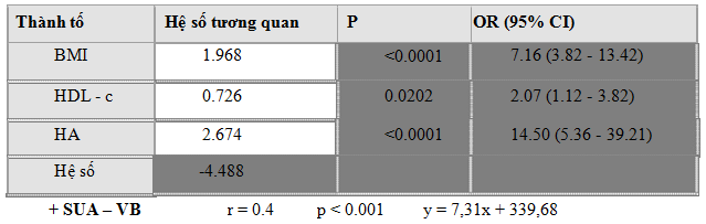 Xem xét những thành tố của HCCH (trong đó vòng bụng được thay BMI) liên quan đến tăng SUA, bằng kỹ thuật hồi quy logistic cho thấy tăng SUA chịu ảnh hưởng nhiều nhất của THA [OR:14,50, KTC 95%: (5.36 -39.21), p < 0,0001] (Bảng 3.21). Nghiên cứu đa phân tích của Grayson và cs ở 55.607 người tham gia: Tăng AU phối hợp với tăng nguy cơ THA (RR: 1.41, KTC 95%: 1.23-1.58). Cứ tăng 1mg/dl của AU sẽ tăng nguy cơ lên 1.13 (KTC 95%: 1.06- 1.20) ở người trẻ (p=0,02) và ở phụ nữ (p=0,059). Tác giả kết luận: Tăng AU làm tăng nguy cơ