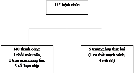 Kết quả:Có 145 bệnh nhân được bít lỗ thông bằng dụng cụ qua thông tim can thiệp trong thời gian nghiên cứu. Thủ thuật thành công ở 140 bệnh nhân (96%). Có 5 trường hợp thất bại (4%). Có 1 trường hợp tràn máu màng ngoài tim, 1 trường hợp nhồi máu não, 3 trường hợp rối loạn nhịp, 4 trường hợp bị trôi dù. Không bệnh nhân nào tử vong.