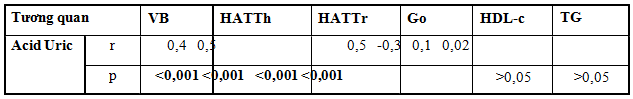 Kết quả: Nồng độ AU nhóm bệnh có tăng huyết áp cao hơn không có tăng huyết áp (367,82±113,53 so với 273,17±91,1 p<0,001); tỷ lệ bệnh nhân tăng AU trong nhóm bệnh có tăng huyết áp là 27.56% so với nhóm không có tăng huyết áp tỷ lệ này là 1.64%.