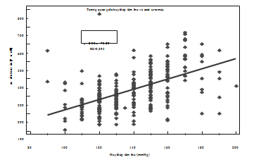 Khi khảo sát nồng độ SUA theo phân độ THA (bảng 7), NĐTB SUA từ mức HA tối ưu đến THA độ 3 tương ứng như sau: 269,35± 109,8452µmol/l/274,31±85,52µmol/l/279,43± 63,77µmol/l /348,6 ±88,24µmol/l/421,80± 109,15µmol/l/462,32 ±145,90µmol/l, sự khác biệt có ý nghĩa thống kê, p < 0,001. Kết quả này tương đồng với các nghiên cứu khác như của Nguyễn Thị Thúy Hằng [7], nồng độ SUA tương ứng THA độ 1,2, 3 là 355,0±41,3µmol/l/372,6 ±36,7µmol/l / 437,9 ± 54,3µmol/l p<0,05).