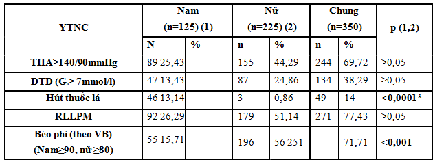 - Các yếu tố nguy cơ: THA chiếm 69,72%, ĐTĐ chiếm 38,29%, béo phì chiếm 71,71%, hút thuốc lá 14%, có sự khác biệt giữa hai giới có ý nghĩa thống kê (p < 0,05).
