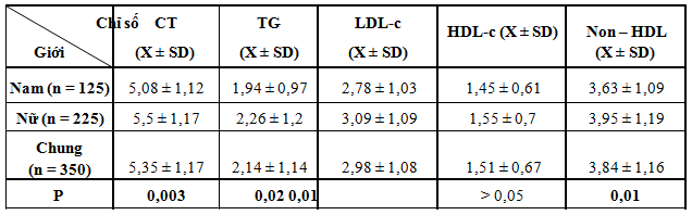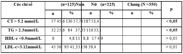 - Tỷ lệ rối loạn lipid máu chiếm 77,4% trong đó nữ cao hơn nam (51,4% so với 26,9%), p<0,005. Tăng CT chiếm 53,4%, TG chiếm 33,1%, LDL-c chiếm 39,4%, HDL-c giảm chiếm 4,9%.