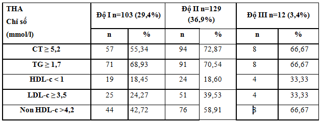 Tăng CT, TG và non HDL-c chiếm tỷ lệ cao ở cả THA độ I, độ II và độ III trong khi LDL- c và HDL-c có tỷ lệ tương đương ở cả 3 mức độ THA.