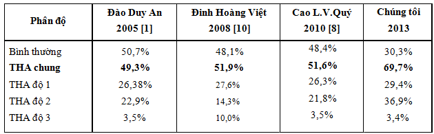 Về tỷ lệ THA nghiên cứu của chúng tôi là 69,7% trong đó THA độ I là 29,4%, THA độ II là 36,9% và THA độ III là 3,4%.