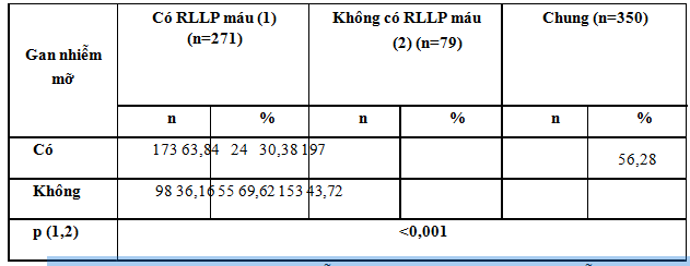 Nghiên cứu của chúng tôi, tỷ lệ gan nhiễm mỡ khá cao 56,28%, tỷ lệ gan nhiễm mỡ có liên quan đến rối loạn lipid máu chiếm 63,84%, tỷ lệ gan nhiễm mỡ không có rối loạn lipid chiếm 30,38%. Sự khác biệt có ý nghĩa thống kê, p<0,001.