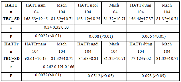 Nhận xét: Theo nghiên cứu của tác giả Mark A. Supiano (2009), nghiên cứu dịch tễ học về THA ở người lớn tuổi có THA nhận thấy: Tỉ lệ hạ huyết áp theo tư thế nằm, ngồi và đứng khác biệt có ý nghĩa thông kê (p=0.0002)[9]. Theo nghiên cứu Jamerson et al. (2007), tác giả nghiên cứu huyết áp tư thế nằm và tư thế đứng ở lứa tuổi >45đi đến kết luận: Huyết áp tư thế nằm cao hơn huyết áp tư thế đứng khác biệt có ý nghĩa thống kê (p= 0.003)[8]. Trong nghiên cứu của chúng tôi, hạ huyết tư thế từ nằm sang ngồi, từ ngồi sang đứng ở cả ba tư thế: Huyết áp tâm thu (HATT), huyết áp tâm trương (HATTr) và huyết áp trung bình (HATB) đều khác biệt có ý nghĩa thống kê (p<0.05; <0.01; <0.0001). 3.3. Tương quan huyết áp theo tư thế với một số yếu tố 3.3.1. Tương quan huyết áp theo tư thế với mạch Bảng 3