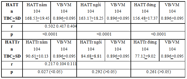Nhận xét: Denardo et al. (2010), nghiên cứu tiến cứu thấy có sự tương quan thuận có ý nghĩa thống kê giữa huyết áp với mạch (p<0.001)[7]. Nghiên cứu của chúng tôi: Có sự tương quan thuận có ý nghĩa thống kê giữa HATT tư thế nằm, ngồi và đứng với mạch với hệ số tương quan r và p lần lượt là: (0.34, <001); (0.32, <0.01); (0.33, <0.01). Có sự tương quan thuận HATTr tư thế nằm với mạch (r=0.262, p<0.01). Không có sự tương quan giữa HATTr tư thế ngồi, đứng với mạch (p>0.05). 3.3.2. Tương quan huyết áp theo tư thế với tỉ VB/VM Bảng 4