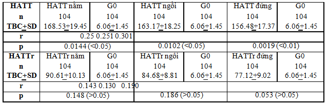 Nhận xét: Theo nghiên cứu của tác giả Lê Thanh Chiến và cs. (2013), khảo sát mối tương quan giữa THA với tỉ VB/VM thì đi đến kết luận: Béo phì theo tỉ số eo mông (béo phì dạng nam) làm tăng nguy cơ THA gấp 3,2 lần. Tỉ lệ VB/VM = 0,82 chung cho hai giới, độ nhạy là 77% và độ đặc hiệu là 48,8%. Ở nữ giới, với tỉ lệ VB/VM = 0,82 thì độ nhạy là 77,9% và độ đặc hiệu là 53,6%. Ở nam, với VB/VM = 0,88 thì độ nhạy là 55,2% và độ đặc hiệu là 58,6%. Tỉ số VB/VM cao có khả năng ảnh hưởng đến THA [1]. Theo nghiên cứu của chúng tôi, có sự tương quan thuận khá chặt chẽ giữa HATT tư thế nằm, ngồi và đứng với tỉ VB/VM với hệ số tương quan r và p lần lượt là: (0.502, <0.0001); (0.417, <0.0001); (0.404, <0.0001). Có sự tương quan thuận thuận giữa HATTr tư thế nằm với VB/VM, hệ số tương quan r = 0.217, p<0.05. Không có sự tương quan giữa HATTr tư thế ngồi và đứng với VB/VM (p>0.05). 3.3.3. Tương quan huyết áp theo tư thế với đường máu lúc đói (G0) Bảng 5