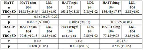 Nhận xét: Theo nghiên cứu của Trần Thị Mỹ Loan và cs. (2009), nghiên cứu mối tương quan giữa chỉ số khối cơ thể và rối loạn lipid máu ở bệnh nhân THA, tác giả nghiên cứu trên 300 đối tượng THA chủ yếu THA giai đoạn I. Trị số trung bình BMI của người THA là: 23,76 ± 3,06, cao hơn hẳn so với BMI của dân số chung. Tỉ lệ rối loạn lipid máu trên bệnh nhân THA là 71,67%, trong đó chiếm tỉ lệ cao nhất là tăng cholesterol toàn phần (67,3%), kế đến tăng triglycerid chiếm tỉ lệ 54,3% và tăng LDL-C chiếm tỉ lệ 32%, giảm HDL-C chiếm tỉ lệ thấp nhất. BMI chỉ có tương quan với cholesterol toàn phần (hệ số r = 0,303, p=0,000) và triglycerid (hệ số r = 0,208, p=0,000). Nghiên cứu của chúng tôi, có sự tương quan thuận khá chặt chẽ giữa HATT theo tư thế nằm, ngồi, đứng với cholesterol máu với hệ số tương quan r và p theo thứ tự là: (0.376, <0.001); (0.35, <0.001); (0.34, <0.001). Không có sự tương quan HATTr theo tư thế với cholesterol máu (p>0.05). 3.3.6. Tương quan huyết áp theo tư thế với LDL máu Bảng 8
