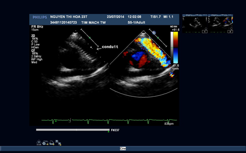 Sau phẫu thuật, hồi sức cho bệnh nhân gặp rất nhiều khó khăn do tình trạng suy thất phải gây giảm cung lượng tim. Tình trạng bệnh nhân cuối cùng đã cải thiện, các dấu hiệu suy tim phải giảm dần, SpO2 cải thiện từ 85% trước mổ lên 94%, trên điện tâm đồ nhịp xoang đều không có các rối loạn nhịp, trên siêu âm tim (Hình 3) vách liên thất kín, động mạch chủ chỉ thông thương với thất trái, ống mạch nhân tạo thông tốt, không còn ống động mạch và có hình ảnh lỗ thông liên nhĩ nhân tạo shunt trái phải và bệnh nhân đã được xuất viện.