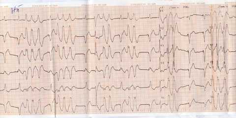 Bệnh nhân không phải nhập viện đến tháng thứ 6 sau cấy máy. Khi khám lại vào tháng thứ 6, bệnh nhân có cải thiện với độ NYHA I. Siêu âm tim Dd = 55 cm và EF = 48%. Trên máy chương trình ghi lại bệnh nhân vẫn còn rất nhiều đoạn tim nhanh thất. Bệnh nhân sau 2 tuần khi kiểm tra lại vào tháng thứ 6, đã phải nhập viện trở lại vì có nhiều nhát đánh sốc liên tục. Máy chương trình cho thấy có nhiều tim nhanh thất. Hình ảnh điện tâm đồ cho thấy rối loạn nhịp thất từ đường ra thất phải (hình 1). Bệnh nhân đã được tiến hành thăm dò điện sinh lý và triệt bỏ tim nhanh thất (hình 2).