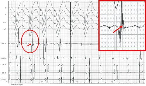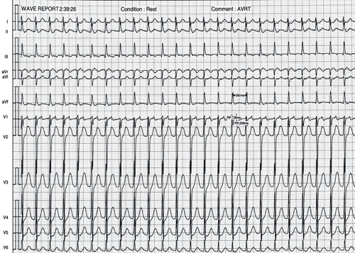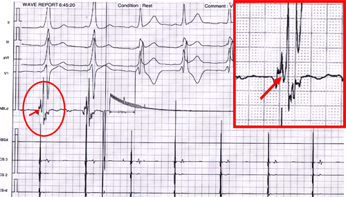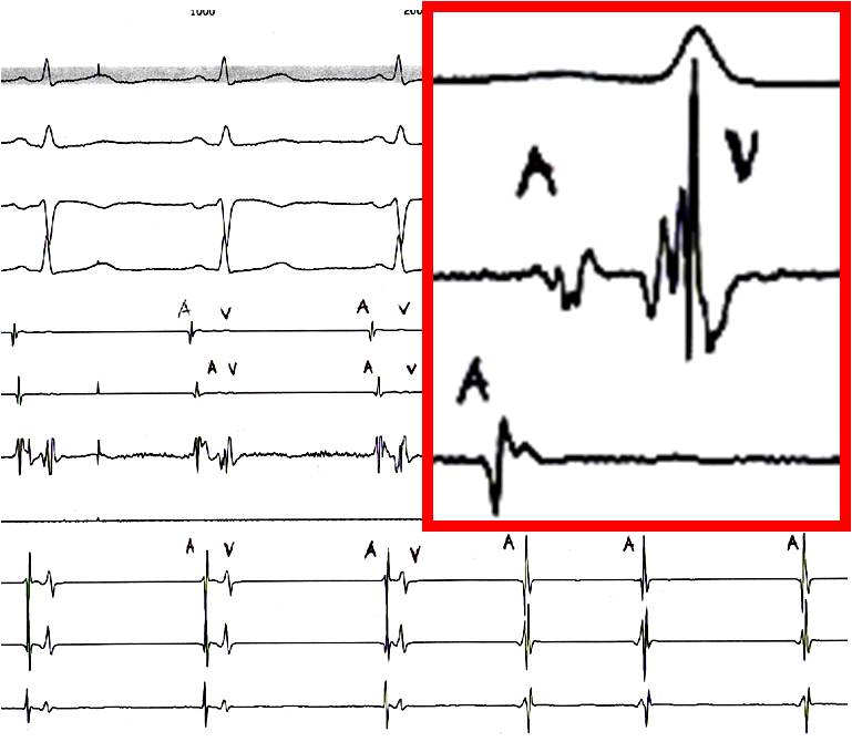 Hình 6: Cơn tim nhanh vào lại nhĩ thất (AVRT). Ở chuyển đạo V1 nhìn rõ sóng P dẫn truyền ngược đi sau phức bộ QRS với RP < PR. Kỹ thuật triệt đốt đường dẫn truyền phụ dựa trên việc đưa đầu ống thông đốt tới tiếp xúc với một điểm trên vòng van hai lá hoặc ba lá nơi có đường dẫn truyền phụ đi qua. Tiếp cận vòng van ba lá bằng đường tĩnh mạch đùi, tiếp cận vòng van hai lá bằng đường ngược dòng động mạch chủ qua động mạch đùi hoặc qua đường xuyên vách liên nhĩ. Đường dẫn truyền phụ được định vị (mapping) dựa vào các điện đồ trong buồng tim trong lúc nhịp xoang, trong lúc cơn tim nhanh vào lại nhĩ thất hoặc trong lúc tạo nhịp thất và dựa vào hỉnh ảnh giải phẫu trên X quang.