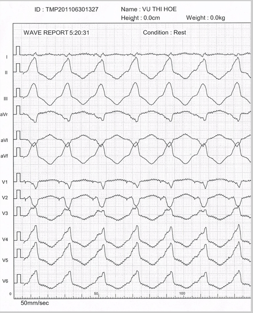 Hình 15: Triệt đốt ngoại tâm thu thất khởi phát từ đường ra thất phải. Xác định vị trí ổ khởi phát bằng phương pháp tạo nhịp thất (pace mapping). Đầu điện cực đốt đã đặt đúng vào ổ ngoại vị nên khi tạo nhịp qua điện cực đốt sẽ gây ra được các phức bộ QRS giống với ngoại tâm thu xuất hiện tự phát 12/12 chuyển đạo.
