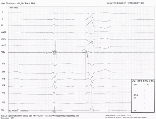 Hình 17: Triệt đốt ngoại tâm thu thất khởi phát từ xoang Valsalva lá vành trái. Xác định vị trí ổ khởi phát bằng phương pháp ghi điện thế sớm nhất. Điện thế thất ghi được ở vị trí đầu điện cực đốt sớm hơn phức bộ QRS trên điện tâm đồ bề mặt 51 ms. Hiện này, tỉ lệ thành công của đốt điện đối với các cơn tim nhanh thất đơn dạng/ ngoại tâm thu thất vô căn vào khoảng > 90%. Đối với các cơn tim nhanh thất trên nền bệnh tim thiếu máu cục bộ, do cơ chất gây loạn nhịp phức tạp, liên quan đến các vùng cơ tim thiếu máu hoặc tổ chức sẹo sau hoại tử cơ tim nên kỹ thuật triệt đốt thường quy như trên gặp khó khăn và có tỉ lệ thành công thấp. Hiện nay, sử dụng hệ thống lập bản đồ điện học và giải phẫu ba chiều sẽ xác định vùng cơ tim hóa sẹo ở tâm thất giúp định hướng cho thủ thuật triệt đốt, tiếp cận ngoại mạc bên cạnh tiếp cận nội mạc đã giúp nâng cao đáng kể tỉ lệ thành công.