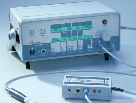 Hình 3: Máy phát năng lượng tần số radio, với các nút điều chỉnh và màn hình hiển thị các thông số triệt đốt: nhiệt độ, trở kháng mô, thời gian đốt. Thông thường, đốt điện sẽ được tiến hành đồng thời với thủ thuật thăm dò điện sinh lý học tim. 2 đến 5 điện cực chẩn đoán (diagnostic catheter) sẽ được đưa vào các buồng tim qua đường tĩnh mạch đùi bên phải và tĩnh mạch dưới đòn bên trái. Các vị trí đặt điện cực chẩn đoán bao gồm: điện cực vùng cao nhĩ phải, vùng mỏm thất phải, điện cực bó His, điện cực xoang vành. Cùng với điện tâm đồ bề mặt 12 chuyển đạo thông dụng, việc ghi các điện đồ trong buồng tim và kích thích tim theo chương trình cho phép chẩn đoán chính xác cơ chế, bản chất các rối loạn nhịp tim và đặc biệt là các cơ chất gây rối loạn nhịp (substrate), đó có thể là một ổ ngoại vị ở tâm thất hoặc tâm nhĩ hoặc có thể là một đường dẫn truyền bất thường. Khi cơ chất của rối loạn nhịp đã được xác định, một loại ống thông khác sẽ được sử dụng là các ống thông đốt (ablation catheter), được thiết kế đặc biệt để vừa có thể ghi được các điện đồ vừa đưa năng lượng tần số radio vào các mô tim nơi đầu điện cực tiếp xúc. Đặc tính có thể gấp duỗi được (steerable) của ống thông cho phép các bác sĩ can thiệp có thể luồn ống thông đốt vào các vị trí khác nhau trong các buồng tim nơi có cơ chất gây loạn nhịp để triệt đốt.