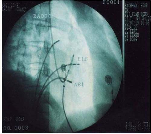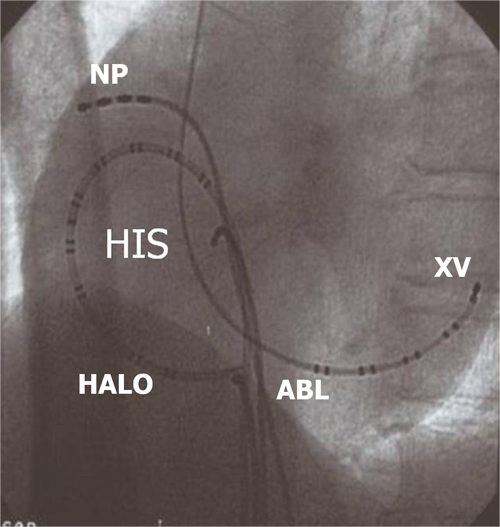 Hình 7: Vị trí các ống thông trên hình ảnh X quang trong triệt đốt đường dẫn truyền phụ: NP: điện cực cùng cao nhĩ phải, His: điện cực vị trí bó His, XV: điện cực xoang vành, TP: điện cực mỏm thất phải, Abl: điện cực triệt đốt được đưa vào thất trái ngược chiều qua van động mạch chủ và cắm vào vòng van hai lá nơi có đường dẫn truyền phụ nhĩ-thất đi qua.