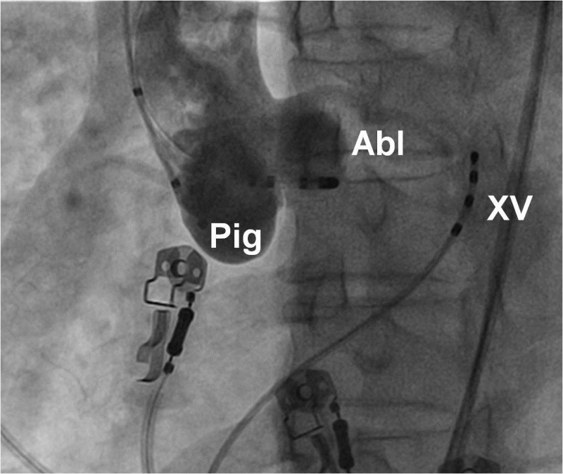 Hình 16: Vị trí các ống thông trên hình ảnh X quang trong triệt đốt ngoại tâm thu thất khởi phát từ xoang Valsalva trên góc nghiêng trái 30 độ: XV: điện cực xoang vành, Pig: ống thông Pigtail chụp xoang Valsalva, Abl: điện cực triệt đốt được đưa vào trong lòng xoang Valsalva lá vành trái, phía trên khoảng 1 cm là lỗ xuất phát của thân chung động mạch vành trái.