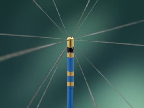 Hình 19: Đầu ống thông đốt với các lỗ bên để tưới dịch làm lạnh mô (irrigated ablation catheter), catheter này có thể giúp đưa được năng lượng tần số radio thấm sâu hơn, tạo nên những tổn thương xuyên thành tâm nhĩ. Tỉ lệ thành công của thủ thuật đối với rung nhĩ kịch phát theo tổng kết từ các trung tâm là khoảng 70-85%. Đối với rung nhĩ dai dẳng và mạn tính, bên cạnh các ổ ngoại vị, cơ chất còn có sự tham gia của các vùng mô ở nhĩ trái, kỹ thuật triệt đốt thường phải kết hợp thêm các đường đốt cô lập khác trong nhĩ trái giống như phẫu thuật Maze (linear ablation) và/hoặc triệt đốt các vùng mô nhĩ có phức bộ điện học phân mảnh phức tạp (CFAE hay CAFE).