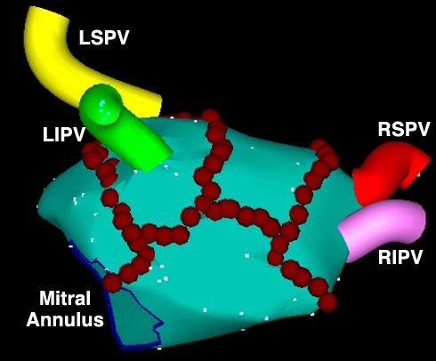 Hình 20: Hình ảnh tái tạo ba trên không gian ba chiều tâm nhĩ trái và 4 tĩnh mạch phổi. Kỹ thuật triệt đốt rung nhĩ kịch phát dự trên cô lập 4 tĩnh mạch phổi bằng các đường đốt điện liên tiếp nhau (các chấm màu đỏ).