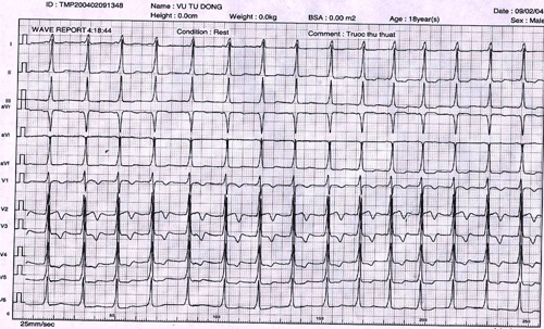 Hình 5: Điện tâm đồ bề mặt của hội chứng WPW điển hình với đường dẫn truyền phụ ở vùng trước vách bên phải. Biểu hiện lâm sàng của hội chứng WPW là các cơn tim nhanh vào lại nhĩ-thất thông qua đường dẫn truyền phụ. Bình thường xung động phát ra từ nút xoang gây khử cực hai tâm nhĩ trước sau đó đi qua nút nhĩ thất gây khử cực tâm thất rồi tự tắt. Khi tồn tại đường dẫn truyền phụ, xung động này sẽ đi ngược qua đó, vào lại tâm nhĩ gây cơn nhịp nhanh với tần số từ 140-220 ck/ph. Mặt khác, hội chứng WPW đặc biệt nguy hiểm trong trường hợp rung nhĩ, các xung động tần số rất cao từ tâm nhĩ sẽ đi qua đường dẫn truyền phụ xuống khử cực tâm thất lầm tâm thất đập rất nhanh (có thể lên tới 300 ck/ph) gây tụt huyết áp, có khi tử vong.