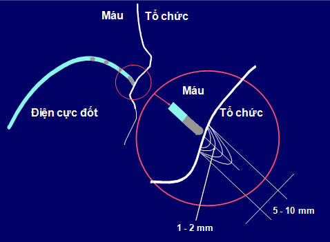 Hình 1: Lược đồ mô tả đường kính và độ sâu tổn thương mô tim gây ra do năng lượng tần số radio. Đường kính tổn thương: 5-10 mm, vùng cơ tim bị đốt nóng nhất có độ sâu khoảng 1 mm.
