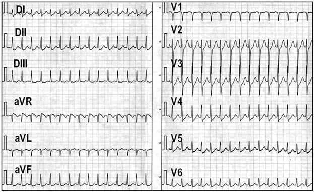 Hình 10: Điện tâm đồ bề mặt của cơn tim nhanh vào lại nhĩ thất kiểu chậm-nhanh. Không thấy rõ hình ảnh sóng P do bị lẫn vào phức bộ QRS. Điều trị cơn tim nhanh vào lại nút nhĩ thất dựa trên cơ sở việc triệt đốt một trong hai đường dẫn truyền qua nút nhĩ thất, đường nhanh hoặc đường chậm. Ngày nay, hầu hết các trung tâm tim mạch trên thế giới đều đồng thuận việc triệt bỏ đường chậm vì có tỉ lệ thành công cao hơn và ít biến chứng gây blốc nhĩ thất hơn. Ống thông đốt sẽ được đưa qua tĩnh mạch đùi tới vị trí triệt đốt đường dẫn truyền chậm ở vùng mô nhĩ phải nằm giữa bờ van hai lá và lỗ xoang tĩnh mạch vành, cách nút nhĩ thất khoảng 1-2 cm (còn gọi là vùng đáy tam giác Koch). Xác định vị trí đường chậm dựa vào điện đồ ghi được tại đầu điện cực đốt và hình ảnh giải phẫu trên X quang.