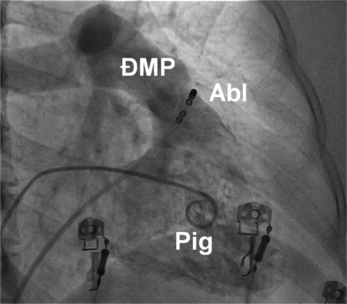 Hình 14: Vị trí các ống thông trên hình ảnh X quang trong triệt đốt ngoại tâm thu thất khởi phát từ đường ra thất phải trên góc nghiêng phải 30 độ: Pig: ống thông Pigtail chụp buồng thất phải, Abl: điện cực triệt đốt được đưa vào vùng đường ra thất phải, ngay dưới van động mạch phổi
