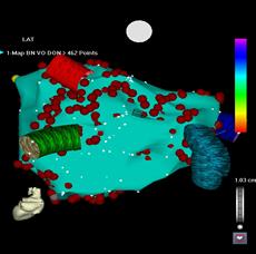 2.4. Quy trình lập bản đồ 3D: Chúng tôi đưa điện cực Navi – Star qua Long sheath vào buồng nhĩ trái dưới màn hình X Quang kỹ thuật số của máy chụp mạch Phillip với mức chiếu tia 3.75 Fr/giây. Chúng tôi di chuyển điện cực 3D vào 04 tĩnh mạch phổi: tĩnh mạch phổi trái trên và dưới; tĩnh mạch phổi trên và dưới để xác định vị trí lỗ đổ về của tĩnh mạch phổi vào nhĩ trái. Điện cực 3D ghi nhận lại toàn bộ hoạt động điện của từng vùng trong nhĩ trái như vùng vách liên nhĩ, tiểu nhĩ trái, vòng van hai lá,…. Mỗi một vị trí trong buồng tim được ghi nhận điện học trên 2mm và hoạt động điện >2ms (LAT: Local activation time). Với buồng nhĩ trái chúng tôi tiếp cận trung bình khoảng 138 ± 25 điểm (từ 120 đến 165 điểm) để dựng hình buồng nhĩ trái 3D về điện học. Chúng tôi sử dụng hình ảnh dựng hình giải phẫu buồng nhĩ trái trên phim chụp MSCT để làm tiêu chuẩn so sánh và đồng bộ hóa điện học 3D buồng nhĩ trái.