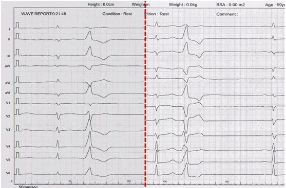 | 26 (33,3%) 24 (30,8%) 2 (2,6%) 2 (2,6%) 3 (3,9%) 2 (2,6%) 6 (7,8%) 2 (2,6%) 1 (1,3%) 3 (3,9%) | 9 (18,0%) 7 (14,0%) 1 (2%) 0 0 1 (2%) 1 (2%) 0 0 1 (2%) | 0,05 0,03 | * Một bệnh nhân có thể mắc ≥ 1 bệnh lý tim mạch hay nội khoa | Tất cả các BN nghiên cứu đều có ngoại tâm thu thất. 17,9% số BN ở nhóm Valsalva và 24% số BN ở nhóm ĐRTP có cơn tim nhanh thất. Tỉ lệ nam/nữ ở nhóm Valsalva xấp xỉ 1: 1, trong khi đó tỉ lệ nữ ở nhóm ĐRTP là 80%, sự khác biệt có ý nghĩa thống kê với p < 0,05. Kết quả nghiên cứu của chúng tôi cũng phù hợp với các tác giả khác: rối loạn nhịp thất từ đường ra thất phải gặp đa số ở nữ giới trong khi rối loạn nhịp thất khởi phát từ xoang Valsalva có phân bố giới nam nữ gần tương đương nhau [4, Error! Reference source not found. ] Tuổi trung bình không khác biệt giữa 2 nhóm (p > 0,05). Ở nhóm Valsalva: BN nhỏ tuổi nhất là 20, lớn tuổi nhất là 82; Ở nhóm ĐRTP: BN nhỏ tuổi nhất là 17, lớn tuổi nhất là 78. HA tối đa trung bình ở nhóm Valsalva cao hơn nhóm ĐRTP (p < 0,05). Sự khác biệt về huyết áp tâm thu là do tỉ lệ bệnh nhân có THA ở nhóm Valsalva là 30,8% cao hơn ở nhóm ĐRTP là 14% (p < 0.05). Ngoài ra, tỉ lệ bệnh tim mạch thực tổn và một số bệnh lý nội khoa khác ở cũng cao hơn ở nhóm Valsalva (19,2% so với 6%, p < 0,05). Thời gian mắc bệnh trung bình (tính từ khi xuất hiện triệu chứng) không khác biệt ý nghĩa giữa 2 nhóm (p > 0,05). Ở nhóm Valsalva, thời gian mắc bệnh thay đổi từ ngắn nhất là 3 tháng đến dài nhất là 20 năm. Số thuốc chống loạn nhịp đã sử dụng trung bình không khác biệt giữa 2 nhóm (p > 0,05). Ở nhóm Valsalva, 100% BN đã dùng ít nhất 1 thuốc chống loạn nhịp. Thuốc chống loạn nhịp được sử dụng phổ biến nhất là chẹn beta giao cảm (83,3%), tiếp đến là amiodarone (70,5%). Ở nhóm Valsalva, 6/78 BN (7,7%) đã được triệt đốt NTTT ở ĐRTP trước đó nhưng không thành công. Đặc điểm điện tâm đồ Bảng 2: Đặc điểm điện tâm đồ 12 chuyển đạo | Thông số | Nhóm Valsalva n = 78 | Nhóm ĐRTP n = 50 | p | Khoảng ghép NTTT (ms) | 456,1 ± 57,9 | 435,5 ± 70,0 | 0,07 | QRS dạng block nhánh phải (n, %) | 78 (100%) | 50 (100%) | - | Độ rộng QRS (ms) | 151,6 ± 17,5 | 164,8 ± 17,6 | 0,0001 | QRS ở DI dương/0/âm (n, %) | 26/21/31 (33,3%, 26,9%, 39,8%) | 22/13/15 (44%, 26%, 30%) | 0,42 | QRS ở DII-III-avF dương (n, %) | 78 (100%) | 50 (100%) | - | Biên độ sóng R ở DII > DIII (tỉ lệ II/III >1) (n, %) | 44 (56,4%) | 30 (60%) | 0,34 | Tỉ lệ thời gian sóng R ở V1 (%) | 32,5 ± 31,3 | 9,4 ± 13,2 | 0,0001 | Tỉ lệ thời gian sóng R ở V2 (%) | 42,7 ± 21,1 | 15,6 ± 13,9 | 0,0001 | Chỉ số thời gian sóng R ≥ 50% (n, %) | 38 (48,7%) | 1 (2%) | 0,0001 | Tỉ lệ biên độ R/S ở V1 (%) | 41,9 ± 52,9 | 9,3 ± 15,2 | 0,0001 | Tỉ lệ biên độ R/S ở V2 (%) | 58,7 ± 48,9 | 13,8 ± 17,2 | 0,0001 | Chỉ số biên độ R/S ≥ 30% (n, %) | 52 (66,7%) | 3 (6%) | 0,0001 | Có sóng S hẹp (≤ 40 ms) và nhọn (n, %) | 55 (70,1%) | 5 (10%) | 0,0001 | Có sóng S ở V6 (n, %) | 10 (12,8%) | 0 (0%) | - | Bảng 3: Đặc điểm chuyển tiếp phức bộ QRS | Thông số | Nhóm Valsalva n = 78 | Nhóm ĐRTP n = 50 | p | Vị trí chuyển tiếp (n) V1 V1V2 V2 V2V3 V3 V3V4 V4 V4V5 V5 V5V6 V6 >V6 | 5 6 2 13 28 15 6 3 0 0 0 0 0 | 0 0 0 1 4 5 25 8 5 1 1 0 0 | | Chuyển tiếp < V3 | 54 (69,2%) | 5 (10%) | 0,0001 | Chuyển tiếp ≤ V3 | 69 (88,5%) | 10 (20%) | 0,0001 | Ở cả hai nhóm Valsalva và ĐRTP, 100% các trường hợp điện tâm đồ có dạng bloc nhánh phải hoàn toàn và trục điện tim quay xuống dưới (QRS dương ở DII, III, aVF). Hình 2: Điện tâm đồ của ngoại tâm thu thất khởi phát từ xoang Valsalva (trái) và đường ra thất phải (phải): QRS có dạng blốc nhánh phải và trục điện tim quay xuống dưới (QRS dương ở D2, D3, aVF). Tuy nhiên, có sự khác nhau về chuyển tiếp phức bộ QRS (trái: trước V3; phải: sau V3).