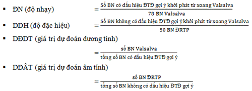 - Thời gian phức bộ QRS của NTTT-TNT (QRSNTTT-TNT) (khoảng A: ms) - Khoảng ghép NTTT (ms) - Chuyển tiếp của phức bộ QRSNTTT-TNT: V6. - Thời gian sóng R ở V1 và V2 (khoảng B: ms). - Tỉ lệ thời gian sóng R ở V1 và V2: thời gian sóng R chia cho thời gian phức bộ QRS (B/A: %). Chỉ số thời gian sóng R là giá trị B/A cao hơn ở một trong 2 chuyển đạo V1 hoặc V2. - Tỉ lệ biên độ sóng R/S ở V1 và V2 (C/D: %). Chỉ số biên độ R/S là giá trị C/D cao hơn ở một trong 2 chuyển đạo V1 hoặc V2. - Sóng S hẹp ở các phức bộ QRSNTTT-TNT sau chuyển tiếp (< 40 ms). - Tỉ lệ biên độ sóng R giữa D2 và D3 là ≥ 1 hay < 1. - Đặc điểm QRS ở chuyển đạo D1: âm, đẳng điện hay dương (-/0/+). Xử lý số liệu - Sử dụng các phần mềm OpenEpi và Exel 2007. - Tính toán giá trị trung bình, độ lệch chuẩn, tỉ lệ phần trăm của các thông số thực nghiệm. - Sử dụng so sánh khi bình phương c2 để kiểm định tính độc lập, sự khác nhau về tỉ lệ. Sử dụng test T-student, ANOVA để kiểm định khác biệt giữa 2 hoặc nhiều giá trị trung bình. Sự khác biệt được coi là có ý nghĩa thống kê với p < 0.05. - Dùng bảng 2 x 2 và test Screening để tính độ nhạy, độ đặc hiệu, giá trị tiên đoán dương tính, giá trị tiên đoán âm tính. KẾT QUẢ NGHIÊN CỨU VÀ BÀN LUẬN Đặc điểm lâm sàng Bảng 1: Đặc điểm lâm sàng của đối tượng nghiên cứu | Thông số lâm sàng | Nhóm Valsalva n = 78 | Nhóm ĐRTP n = 50 | p | Thể lâm sàng (n, %): | 14 (17,9%) 64 (82,1%) | 12 (24%) 38 (76%) | 0,4 | Nam/ nữ (% nam) | 36/42 (46,2%) | 10/40 (20%) | 0,002 | Tuổi trung bình | 52,6 ± 13,6 | 47,9 ± 14,8 | 0,07 | Tần số tim lúc nghỉ (ck/ph) | 75,8 ± 10,6 | 73,5 ± 13,2 | 0,27 | HA tối đa (mmHg) | 127,8 ± 18,1 | 120,3 ± 15,5 | 0,02 | HA tối thiểu (mmHg) | 75,1 ± 8,9 | 75,9 ± 11,5 | 0,66 | Thời gian triệu chứng (năm) | 3,6 ± 3,6 | 3,8 ± 3,2 | 0,75 | Số thuốc chống loạn nhịp đã sử dụng | 1,79 ± 0,79 | 1,72 ± 0,79 | 0,62 | Đã được đốt điện ở ĐRTP nhưng không thành công | 6 (7,7%) | 0 | - | Bệnh lý tim mạch* (%): - THA