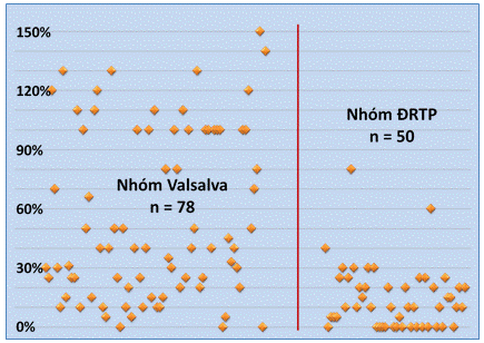 Biểu đồ 1 cho thấy, phân bố chỉ số thời gian sóng R ở nhóm Valsalva phân bố tương đối đồng đều từ 0 – 100%. Trong khi ở nhóm ĐRTP, phân bố chỉ số thời gian sóng R thường dưới 50%.