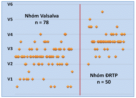 Biểu đồ 2 cho thấy, phân bố chỉ số biên độ R/S ở nhóm Valsalva cũng phân bố tương đối đồng đều từ 0 – 150% (một số trường hợp sóng R > sóng S ở V1 hoặc V2). Trong khi ở nhóm ĐRTP, phân bố chỉ số thời gian sóng R thường dưới mốc 30%. Nếu lấy “lát cắt” chỉ số biên độ R/S là ≥ 30% để chẩn đoán nguồn gốc rối loạn nhịp từ xoang Valsalva cũng sẽ cho độ đặc hiệu rất cao (bảng 4). Biểu đồ 3: Phân bố chuyển tiếp QRS rối loạn nhịp thất ở nhóm Valsalva (trái) và nhóm ĐRTP (phải)