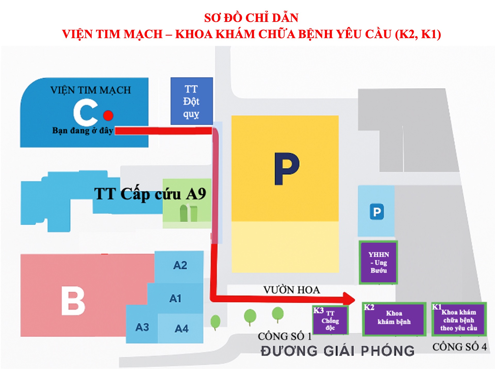 Sơ đồ chỉ dẫn Viện Tim mạch - Khoa Khám chữa bệnh yêu cầu (K2,K1)