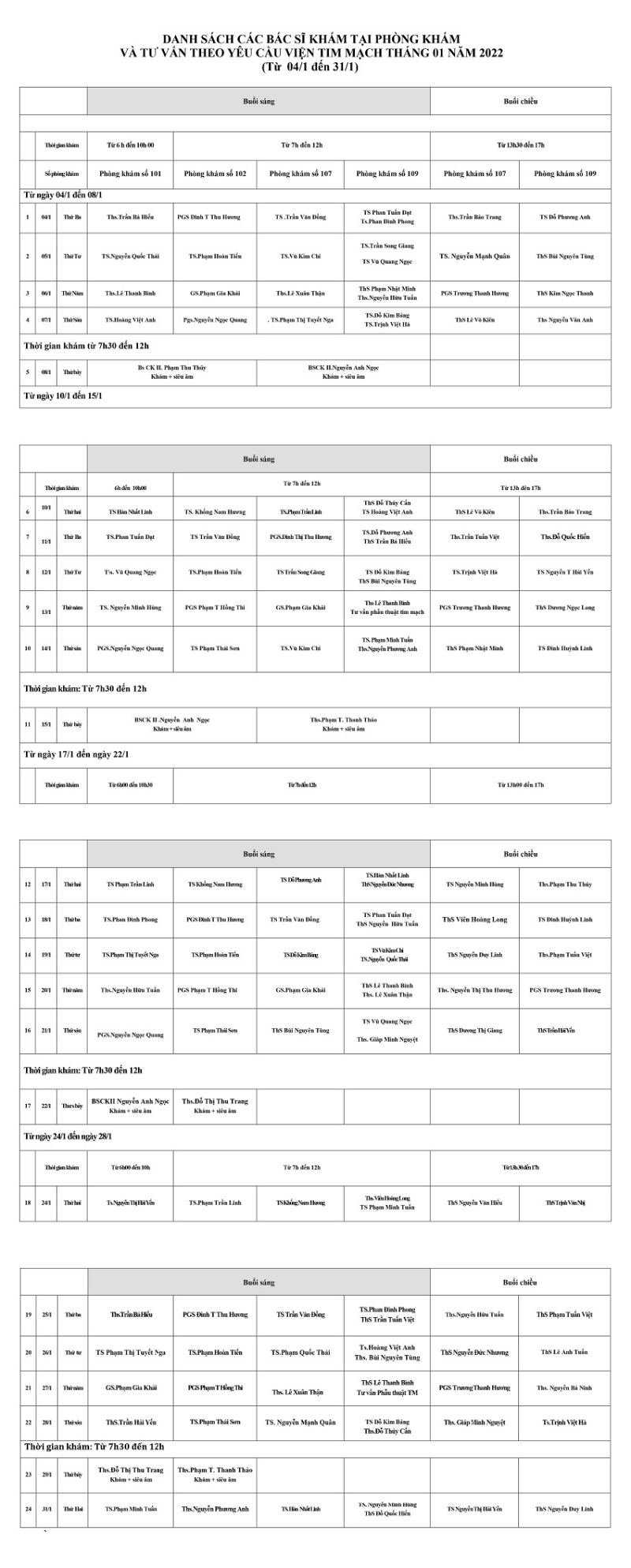 Lịch khám và tư vấn theo yêu cầu tháng 1 -2022