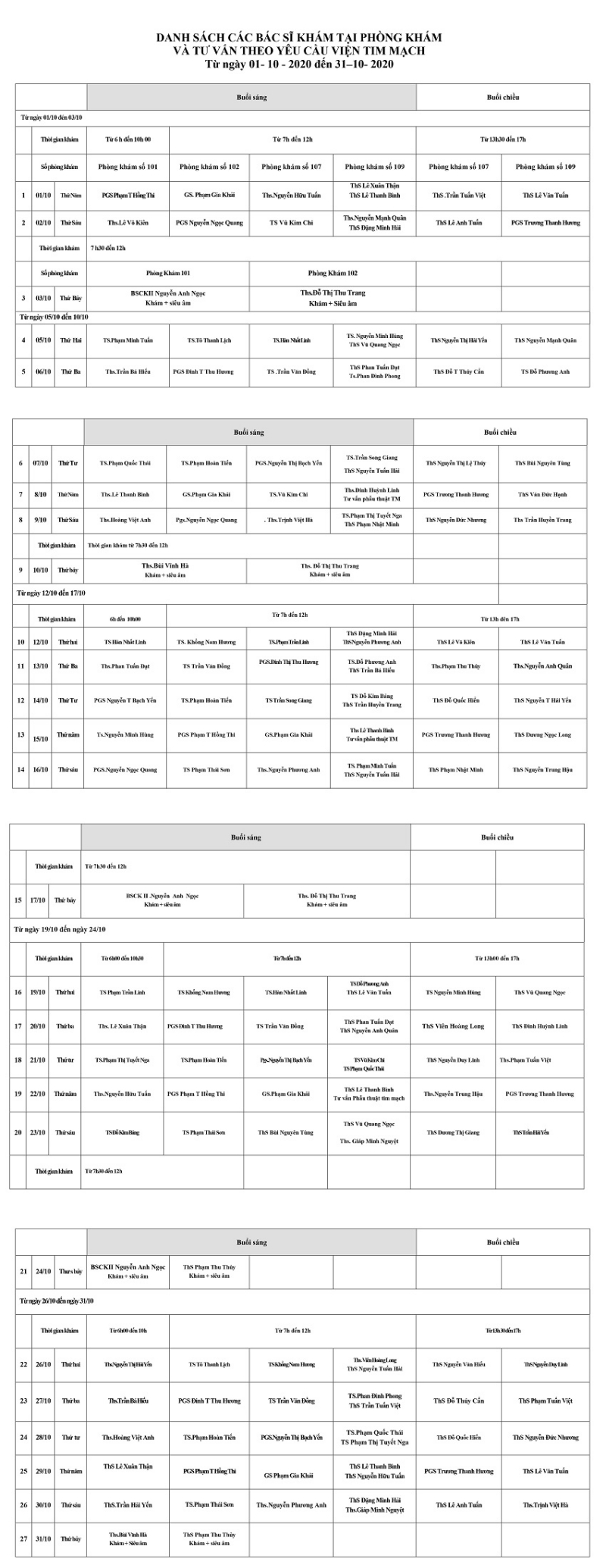 Lịch khám và tư vấn theo yêu cầu tháng 10 -2020